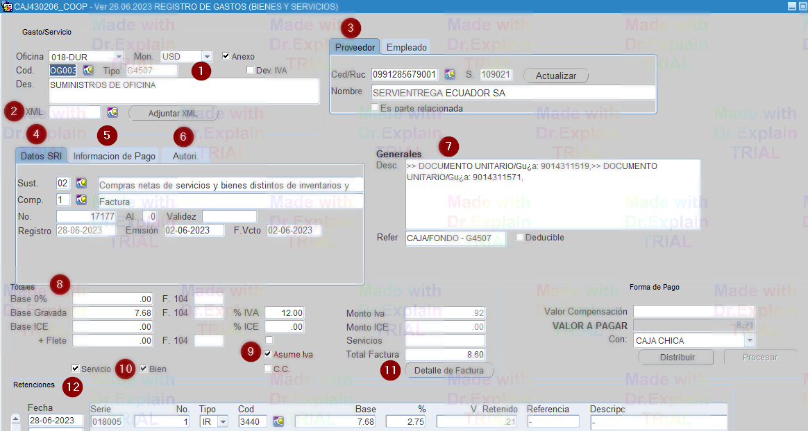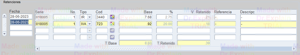 12. En Retenciones por defecto trae las retenciones grabadas por defecto de aceurdo al tipo de gastos: Servicios o bienes